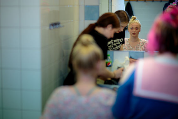 Den här dagen hade en bra start. Vi kom dit i tid och blev klara med uppsättningen av bakgrunden mycket tidigare än vad vi trodde. En efter en droppade modeller och annat folk in som skulle hjälpa till och dagen rullade på sakta men säkert. Vi blev klara en timme senare än vad vi trodde , men bilderna blev väldigt bra och vi hade det trevligt. Det kändes inte som att det var någon stress på oss som designers och det var en bra attityd kring hela eventet. Två utav mina plagg gick sönder under fotograferingen. Den vita kjolen och en topp. Så jag nålade in modellen med vit kjol eftersom det var dragkedjan som åkte ur, men jag hann sy ihop min topp då mina modeller blev fotade sist. Att plocka undan efteråt gick också snabbare än vad vi trodde vilket var bra. Vi fick mycket hjälp av två stycken makeupartister, en professionell fotograf och en del vänner och släktingar som var närvarade. Jag tyckte det var mysigt!