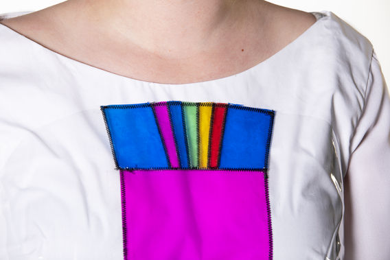 För det här plagget tog jag inspiration från kyrkfönster. Jag använde mig av genomskinlig vaxduk och färgad cellofan för att få det att se ut som glas. Plasten var väldigt svår att jobba med och det tog lång tid så min tanke från början var att försöka återskapa ett kyrkfönster på hela klänning men jag insåg att det inte skulle funka så jag fick tänka om.